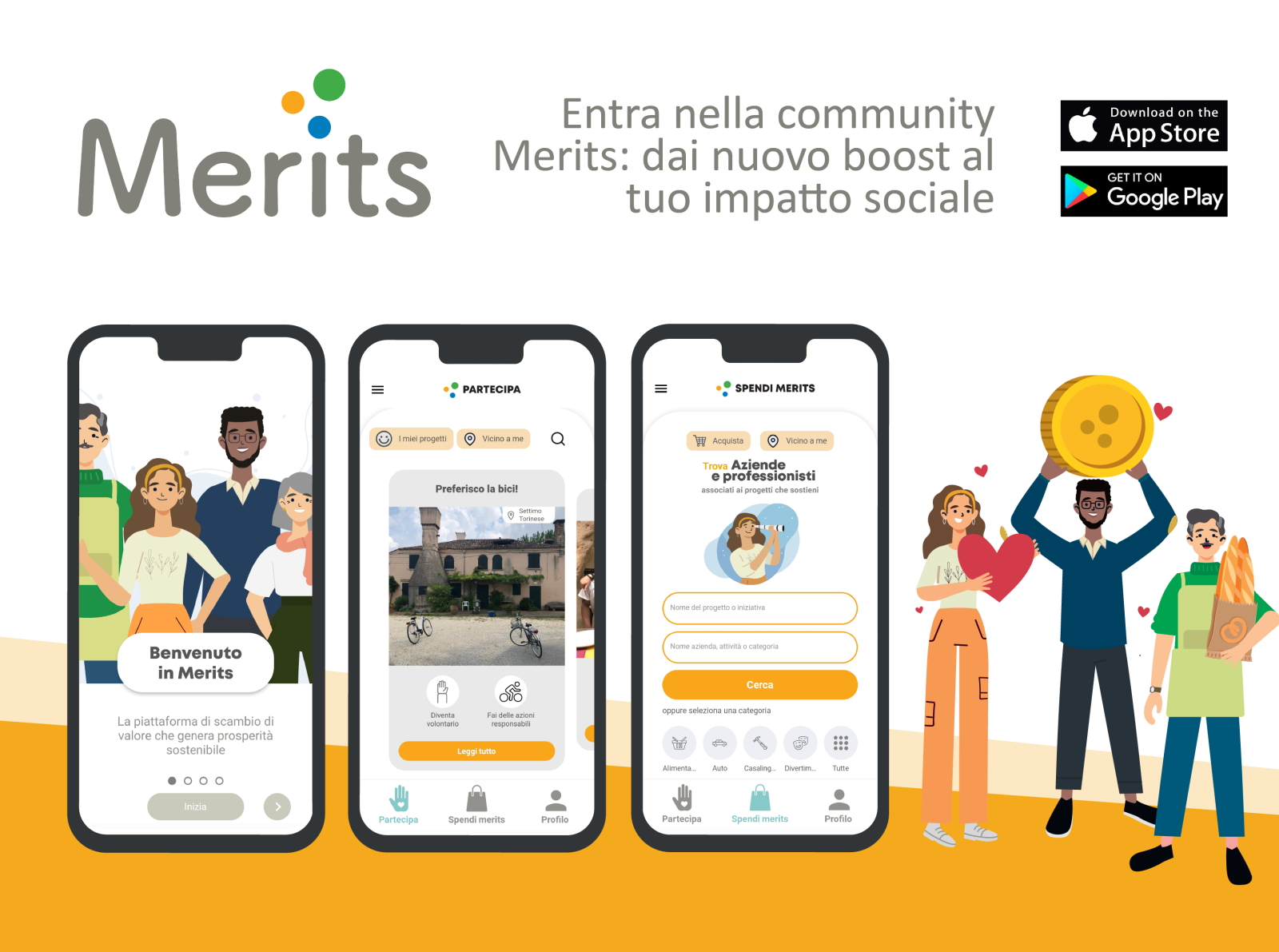 Merits Economy è una app gratuita che ti aiuta a moltiplicare il tuo impatto sociale positivo: “boost your social impact”. Tramite l’app puoi trovare i progetti ad impatto sociale ed ambientale organizzati dal tuo comune, da enti non profit, e da gruppi di cittadini e partecipare come volontario o come donatore. Riceverai dei merits come segno di gratitudine, e potrai sostenere l’economia virtuosa acquistando con i tuoi merits beni e servizi presso gli esercizi commerciali di prossimità e presso gli e-commerce virtuosi. Consultando le schede di approfondimento dei progetti di tuo interesse, puoi decidere di inviare la richiesta di candidatura per il ruolo di tuo interesse. Il team di Merits esaminerà la tua richiesta e, se ci sono i requisiti, procederà ad ammetterti al progetto. Nell’app ‘Merits Economy’, per ogni progetto a cui partecipi, hai un wallet digitale che ti consente di ricevere e spendere i merits con una procedura semplicissima: il negozio convenzionato inquadrerà il QR code generato e confermerà la transazione. Quando ricevi, e quando spendi i merits, il processo avviene in modo totalmente trasparente: ogni transazione è salvata sul cloud e sulla blockchain e non è alterabile da nessuno! Tutta la piattaforma ‘Merits Economy’ è estremamente affidabile, scalabile e sicura, dato che la sua architettura tecnologica è basata sui servizi cloud di Google (Google Cloud Platform). Le applicazioni iOS e Android sono sempre mantenute aggiornate alle ultime versioni dei rispettivi SDK e compatibili con tutti i dispositivi. Merits si propone di costituire nuove relazioni di collaborazione tra organizzazioni del terzo settore, donatori e operatori economici contribuendo a rafforzare il senso di comunità e a integrare maggiormente il tessuto sociale. Merits è in grado di fornire alle Pubbliche Amministrazioni un supporto alle loro politiche, rafforzando la capacità di conseguire i risultati e gli effetti attesi, orientando i comportamenti degli individui, delle famiglie, delle organizzazioni. Merits, favorisce l’esercizio di responsabilità sociale delle aziende aiutandole a valorizzare le scelte dei cittadini che agiscono comportamenti virtuosi e dei donatori che scelgono di sostenere le associazioni non profit.