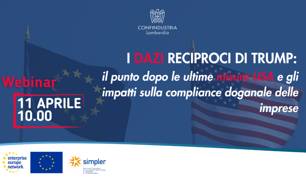 Confindustria Lombardia organizza, nell'ambito delle attività di Enterprise Europe Network, il webinar dal titolo "I dazi reciproci di Trump: il punto dopo le ultime misure USA e gli impatti sulla compliance doganale delle imprese" in programma per venerdì 11 aprile p.v. alle ore 10.00.
