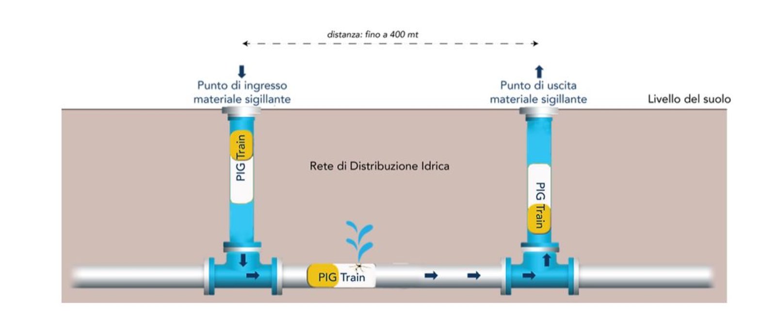 Il PIG-Train, percorrendo la tubazione principale, sigilla immediatamente ogni perdita presente anche negli allacci utente.