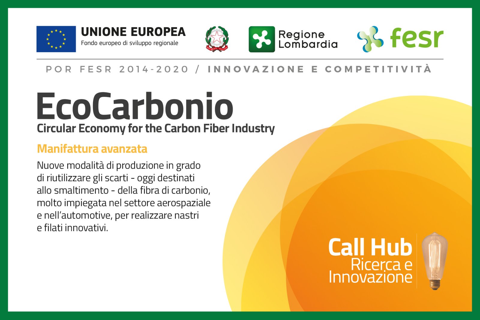 Da rifiuto a risorsa, da scarto oggi destinato alla discarica a materia prima seconda, con caratteristiche tecniche innovative. Questa la nuova vita proposta per le fibre di carbonio dal progetto EcoCarbonio, uno dei 33 vincitori del bando “Call Hub Ricerca e Innovazione” di Regione Lombardia, finanziato anche grazie a fondi POR-FESR 2014-2020.