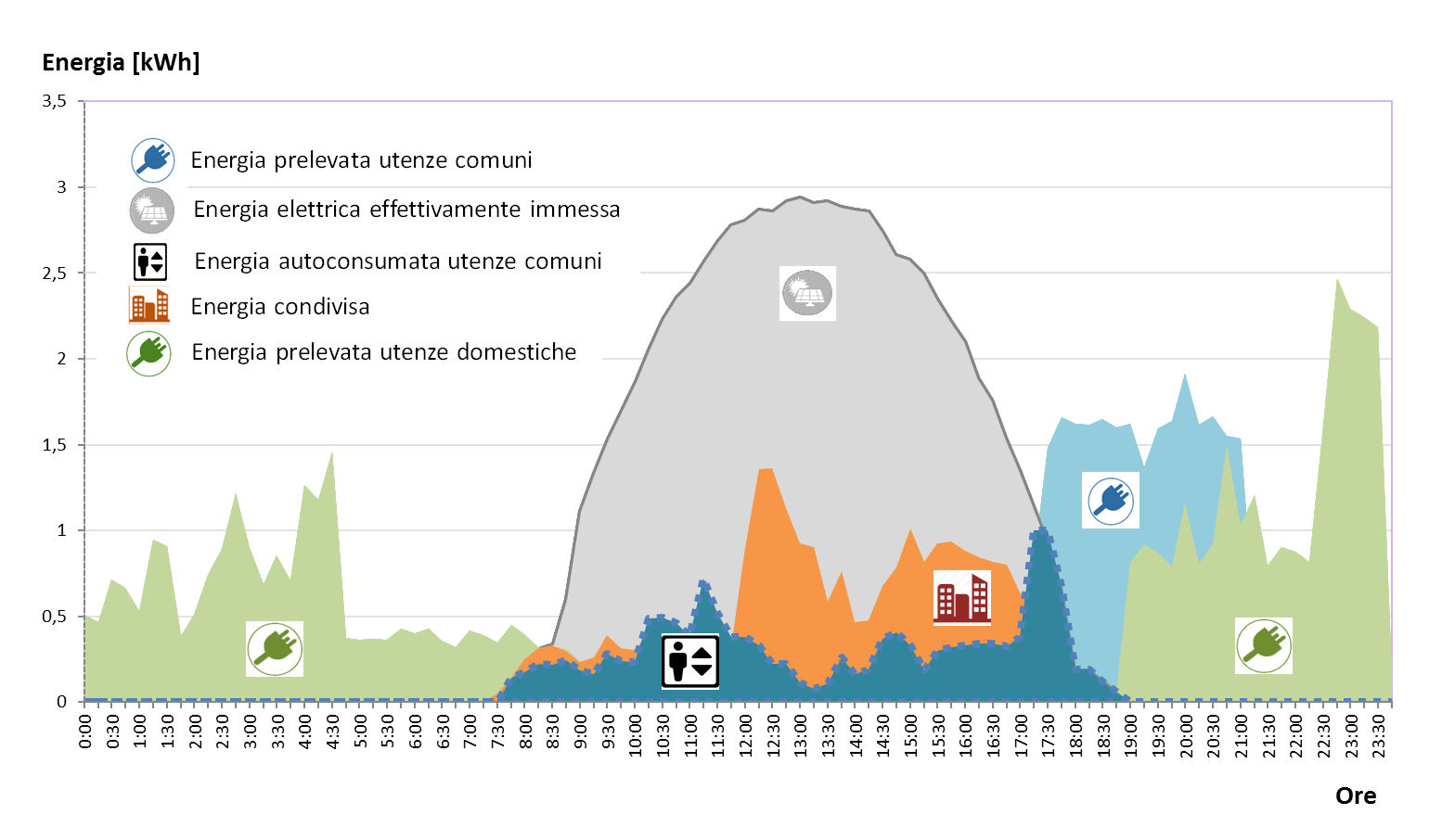 - energia elettrica condivisa: è, in ogni ora, il minimo tra la somma dell’energia elettrica effettivamente immessa e la somma dell’energia elettrica prelevata per il tramite dei punti di connessione che rilevano ai fini di un gruppo di autoconsumatori di energia rinnovabile che agiscono collettivamente o di una comunità di energia rinnovabile