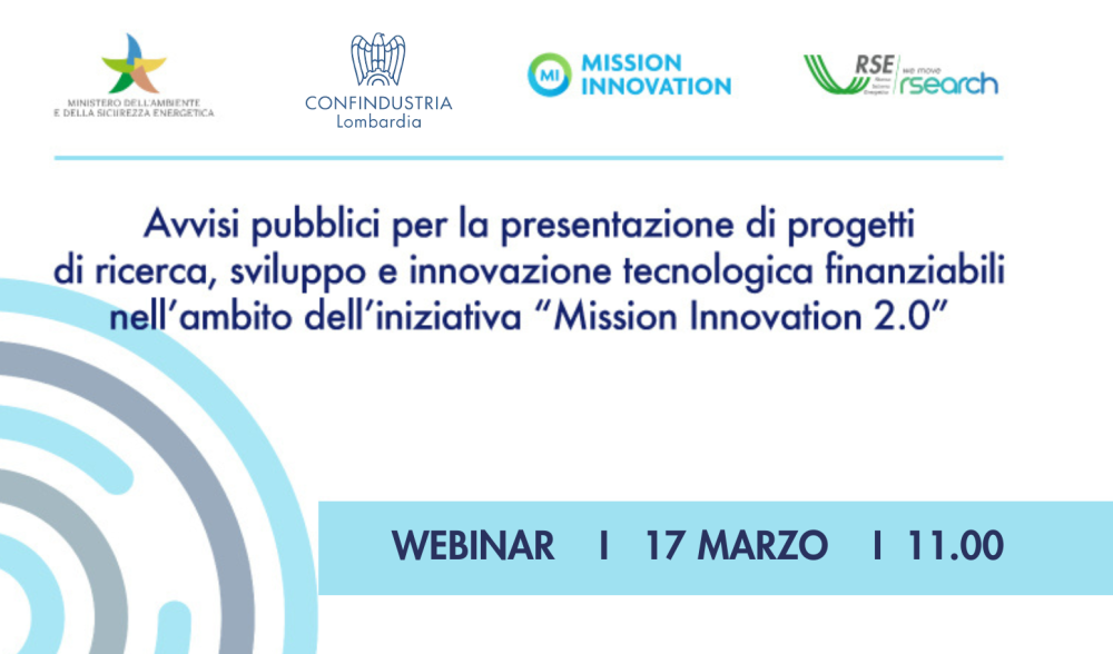 Lunedì 17 marzo 2025, dalle ore 11.00 alle ore 13.00, si terrà online la Sessione di informazione interattiva, organizzata da Confindustria Lombardia in collaborazione con RSE e Ministero dell'Ambiente e della Sicurezza Energetica, per diffondere informazioni sugli Avvisi pubblici, di prossima pubblicazione, per la presentazione di progetti di ricerca, sviluppo e innovazione tecnologica finanziabili nell’ambito dell’iniziativa “Mission Innovation 2.0”.