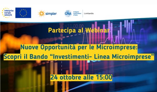 Partecipa al webinar gratuito organizzato da CNA Lombardia il 24 ottobre 2024 per scoprire come accedere ai finanziamenti del bando "Investimenti Linea Microimprese." Registrati subito!
