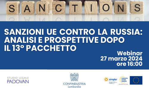 Confindustria Lombardia, in collaborazione con lo Studio Legale Padovan, organizza il webinar “Sanzioni UE contro la Russia: analisi e prospettive dopo il 13° pacchetto”, in programma mercoledì 27 marzo 2024 alle ore 16.00.